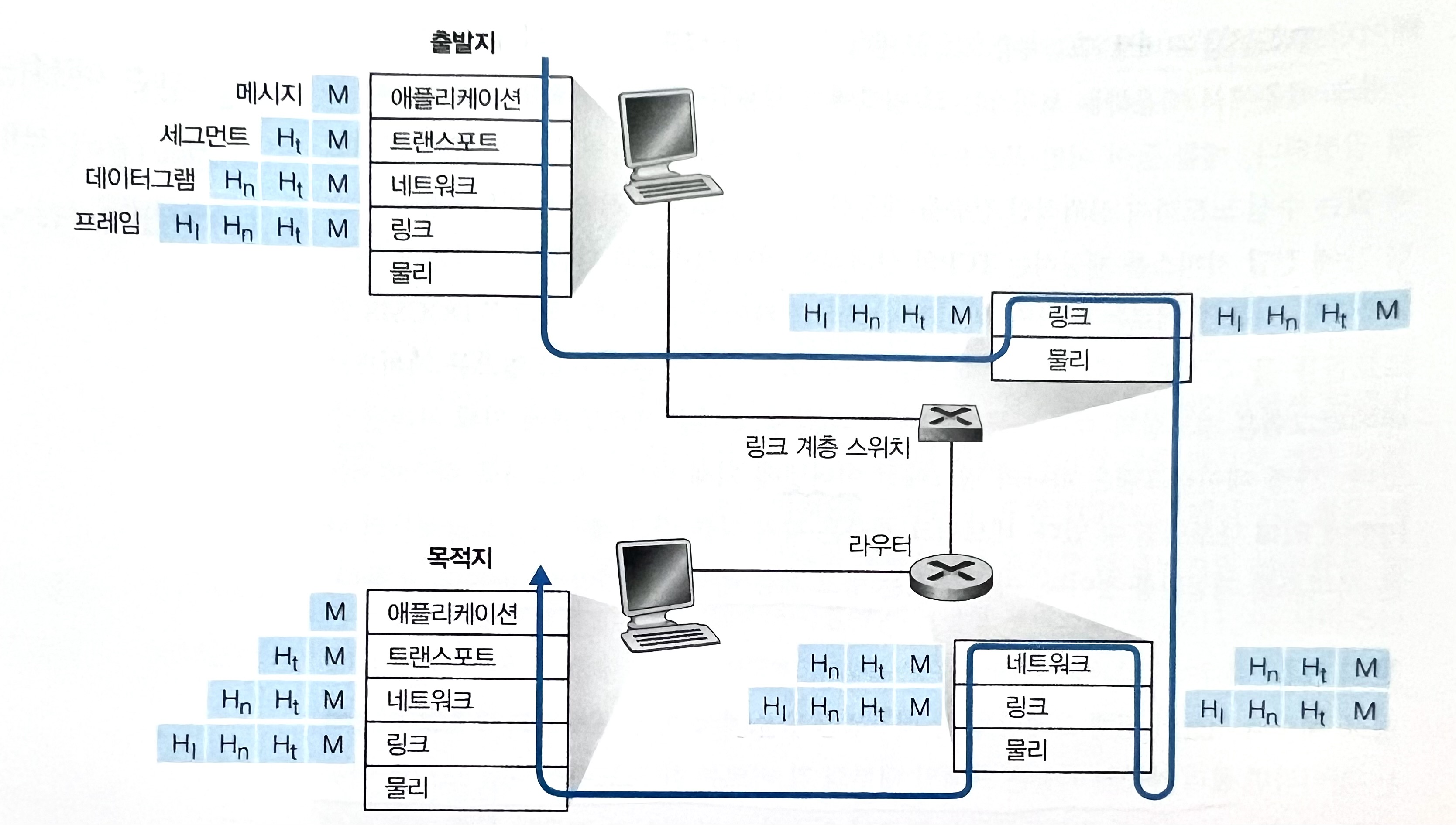 응용 계층에서 보내려는 메시지는 각 계층을 거치며 헤더를 추가합니다.